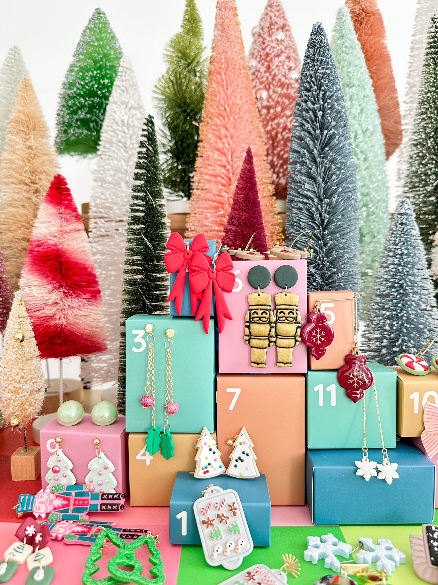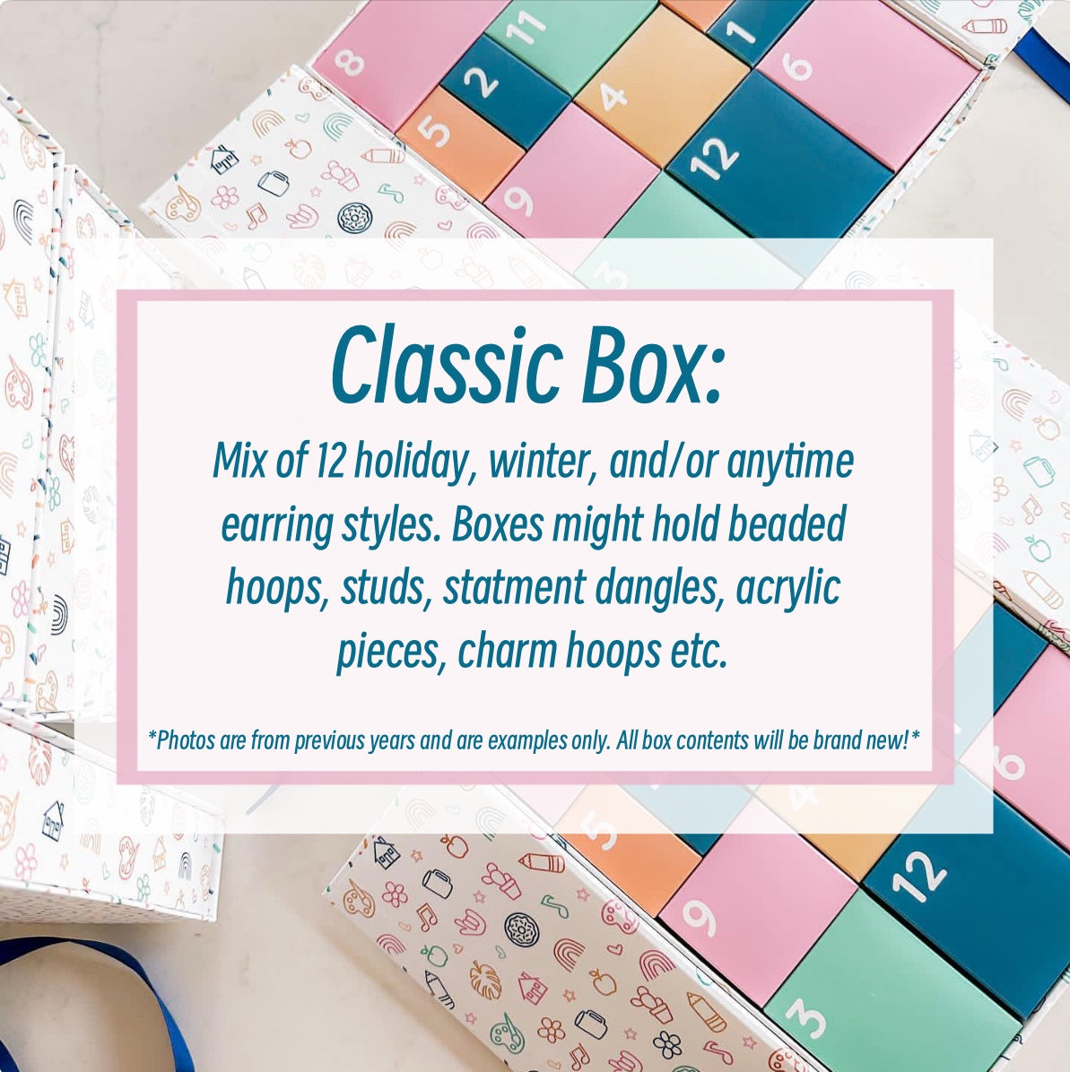 All advent boxes come with 12 different pairs of earrings (or other products if purchasing the Teacher box). Sets will all be surprises- there is no guarantee which earrings will be in your box! The first 8 photos of this listing show just a sampling of possibilities from 2024 (the rest are a glimpse at past year’s earring designs to show you size and variety!). You will receive a mix of styles; studs, beaded hoops, large dangles, small dangles, simple designs, intricate designs and more. It is up to our discretion which earrings we select as ‘holiday” vs “non holiday” but boxes will be roughly split into half holiday and half non holiday or winter. We are positive you will be thrilled with your box!
