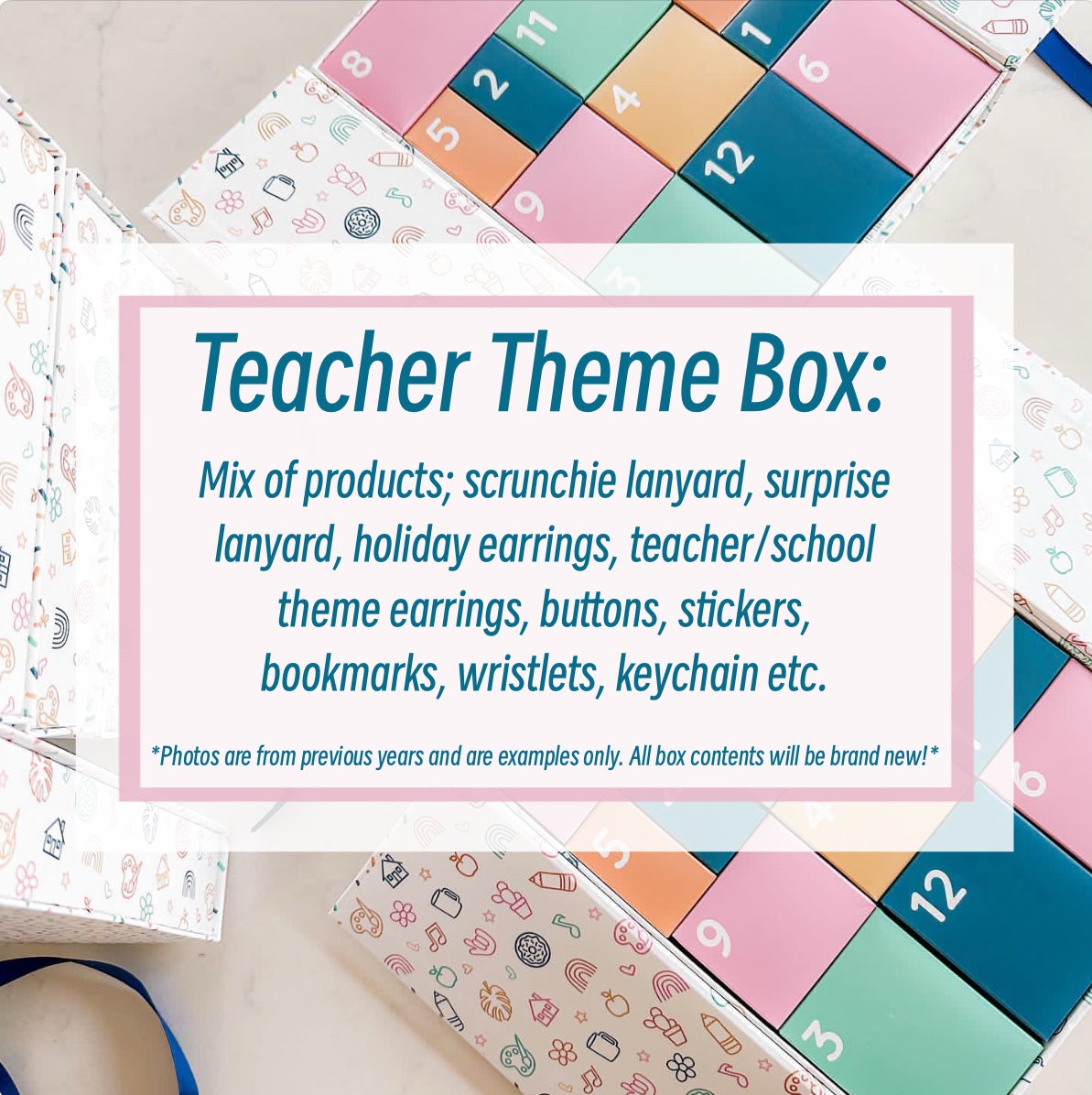 Brand new this year is our TEACHER theme box! This box will have a mix of illy Lilly products including a scrunchie lanyard, surprise lanyard, button set, sticker set, teacher/school theme earrings, holiday earrings and more!