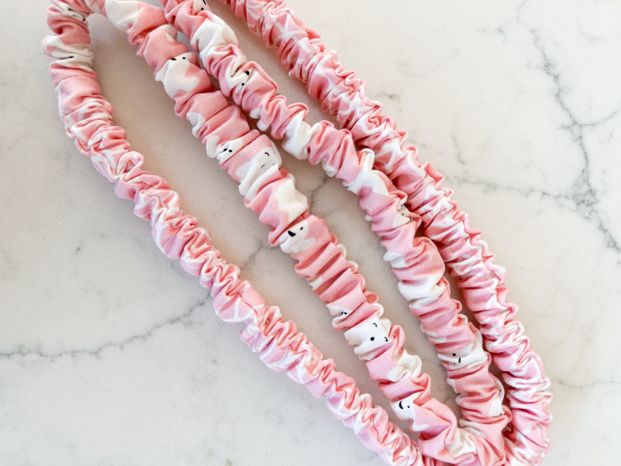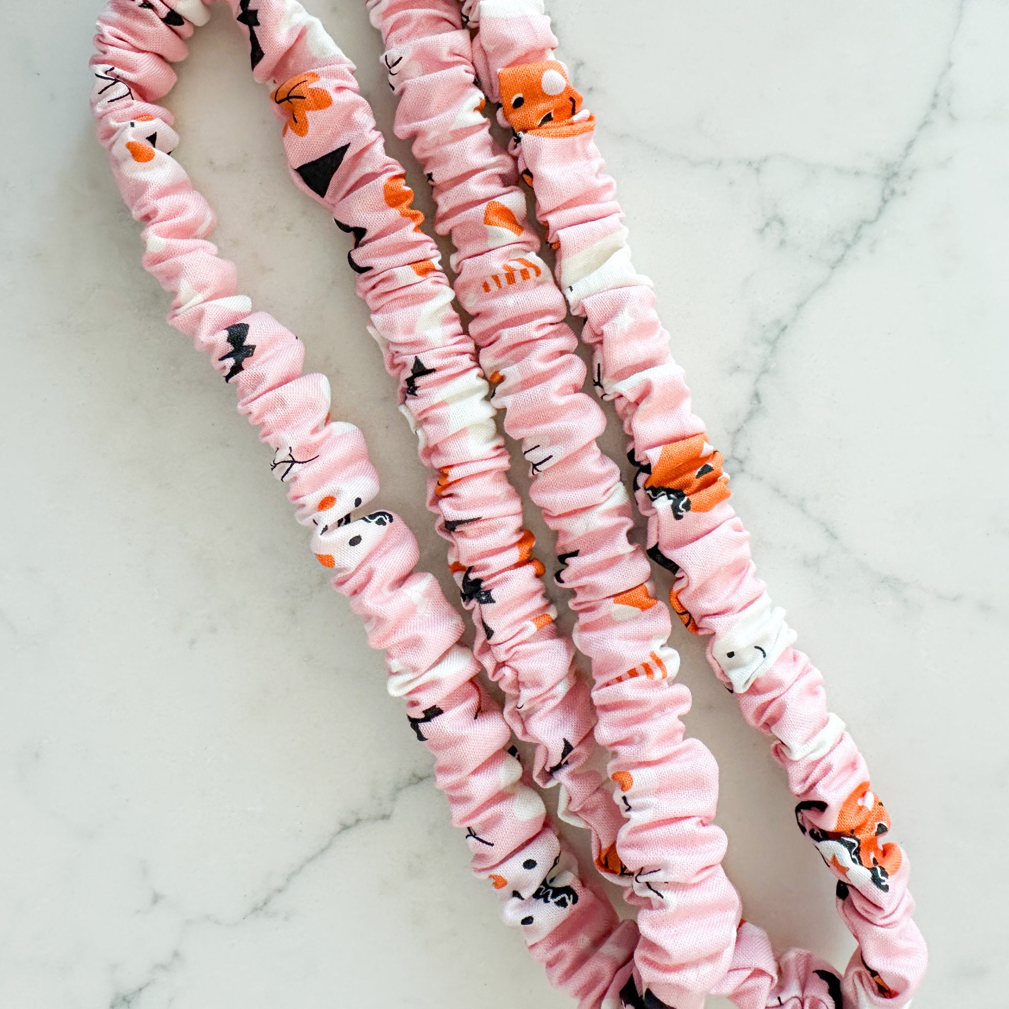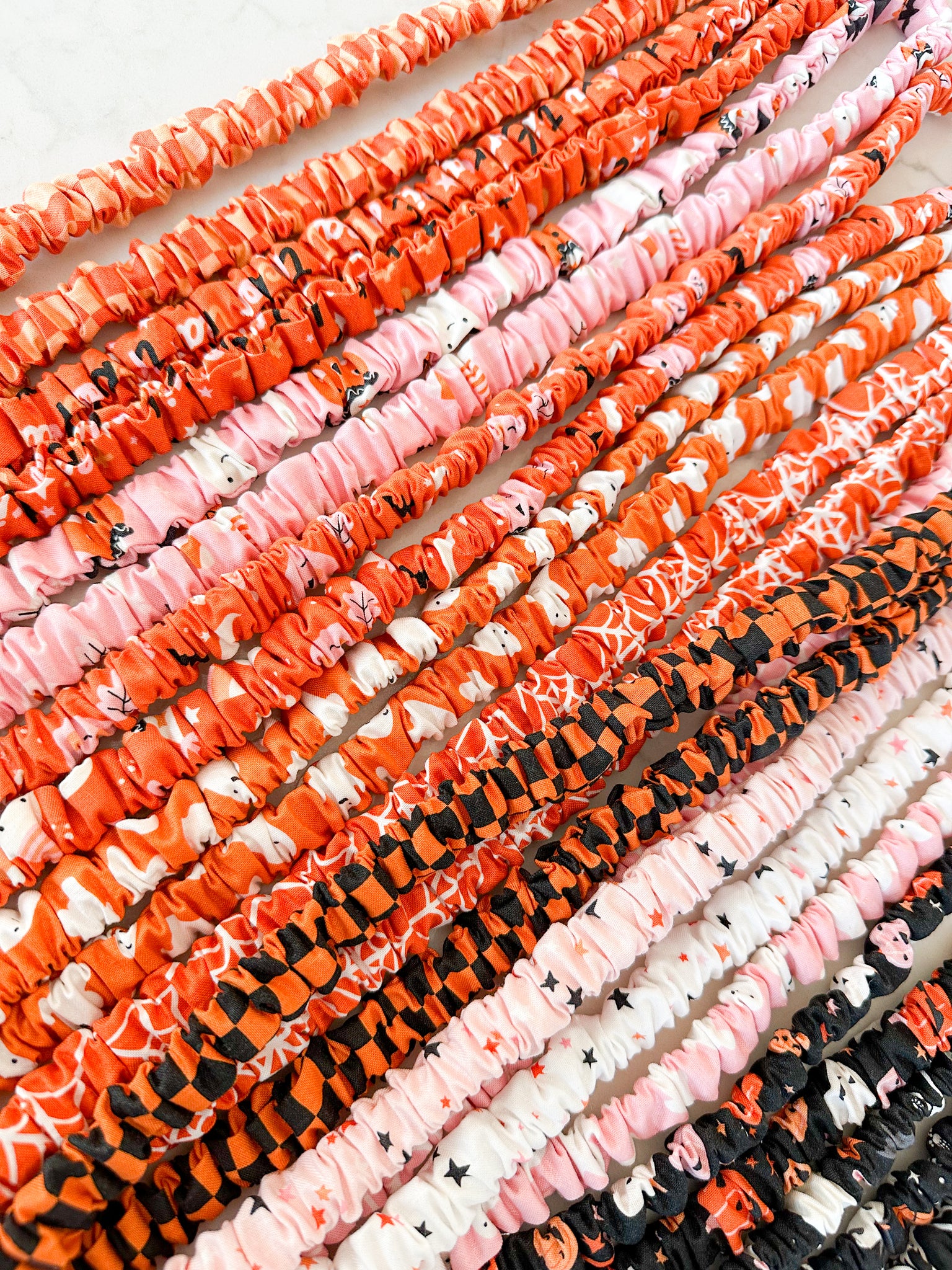 Our brand new scrunchie lanyards are finally here and so cute for fall! This particular collection uses one of the cutest Halloween print collections of all time and each lanyard is one of a kind. Please not a “ready to ship” selection from the dropdown menu indicates item will ship with normal turnaround time estimate of 5-7 business days). A “ships in 2 weeks” selection from the drop-down menu indicates item will be made to order and shipped upon completion (first days of October!)