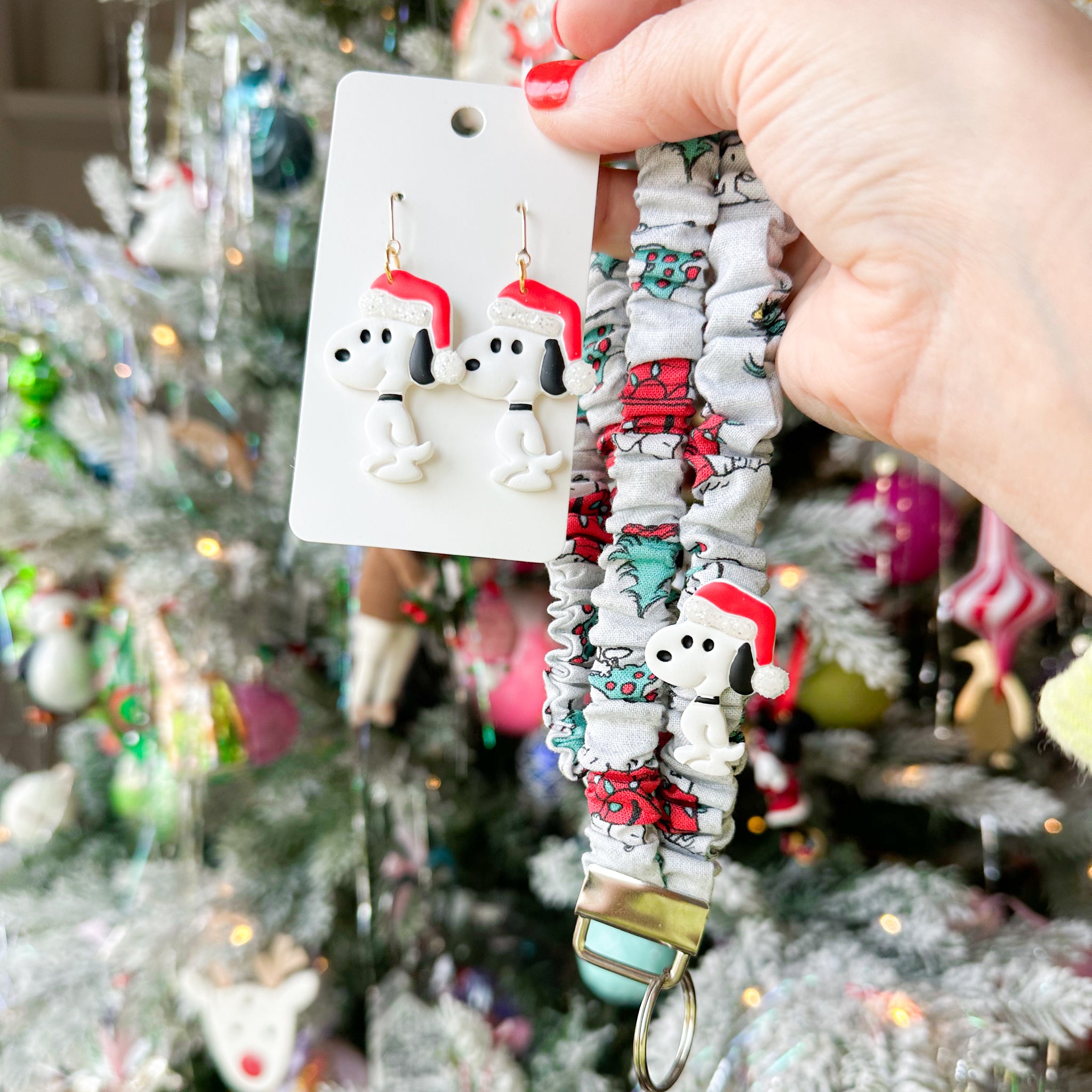 Set includes scrunchie lanyard, snoopy pin and snoopy earrings!
